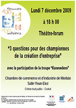 Soirée de théâtre-forum sur le thème de la création d’entreprise par les femmes. Ouverte à tous : les femmes qui ont un projet, leur entourage, les professionnels qui les accompagnent…3 scaynettes jouées par la troupe « Kanevedenn » mettront en scène des femmes en situation de travail, en réflexion sur leur projet… Le public sera invité à imaginer une (...)