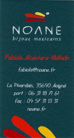 Fabiola ALCANTARA, propriétaire de la société « NOANE », commercialise une gamme de bijoux en argent massif 925/°°°, 100% mexicains et pour une grande partie d’entre eux, « hechos a mano » soit fait à la main suivant un savoir faire traditionnel et rural ainsi qu’un design imprégné du quotidien.